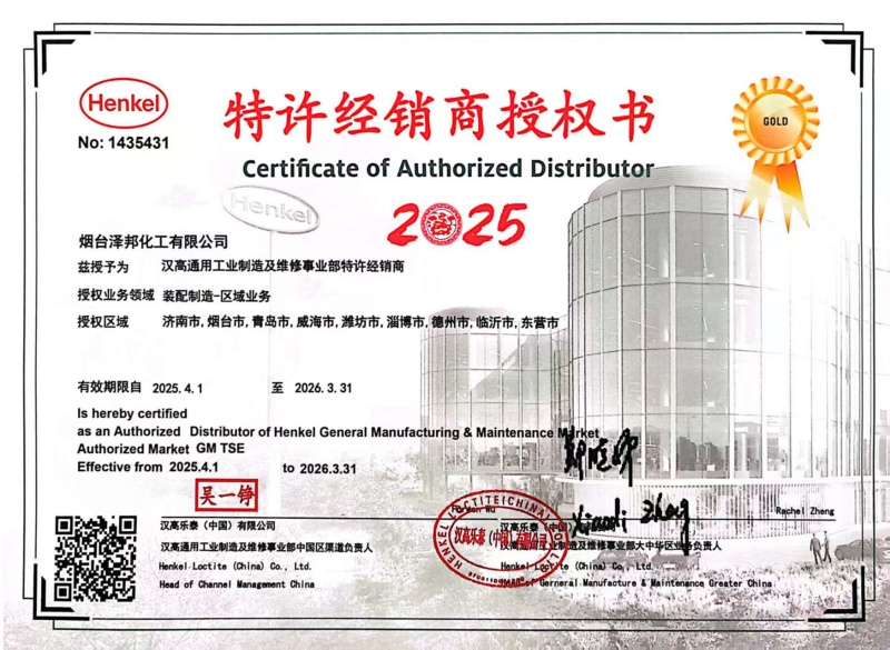 我们烟台泽邦化工有限公司与汉高合作已长达十数年,具体可以追溯于2005年,是汉高公司授权的经销商,长期代理乐泰胶水。