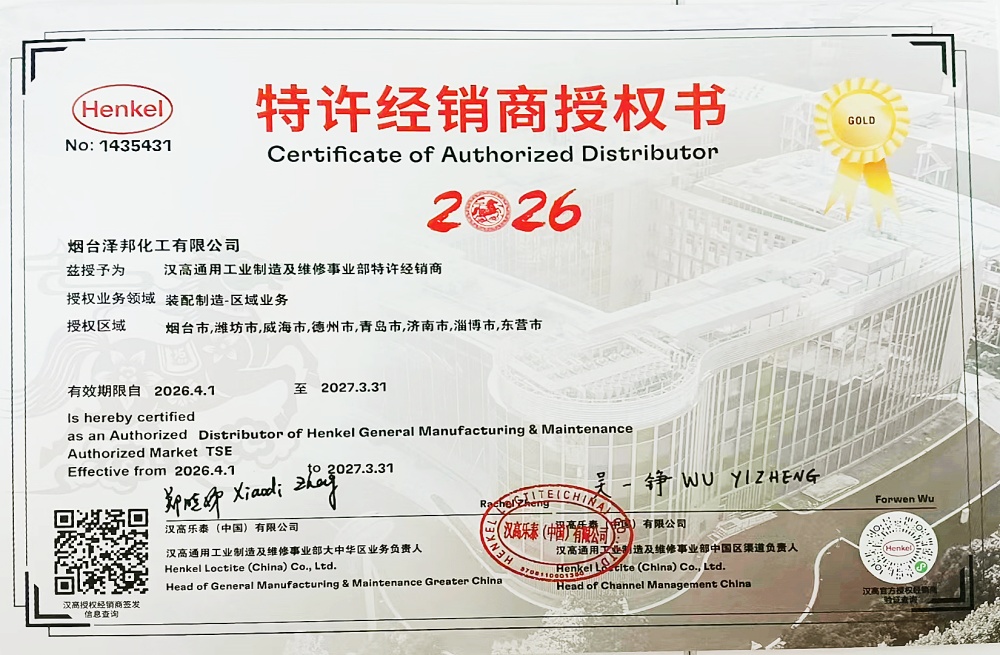 我们烟台泽邦化工有限公司与汉高合作已长达十数年,具体可以追溯于2005年,是汉高公司授权的经销商,长期代理乐泰胶水。
